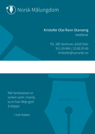 Dersom nokon plutseleg får behov for (og pengar til) å laga visittkort (til dømes ... tja, det finst kanskje ikkje så mange døme. Men om de vil gleda Kristofer, då, i det minste), kan de bruka denne malen.